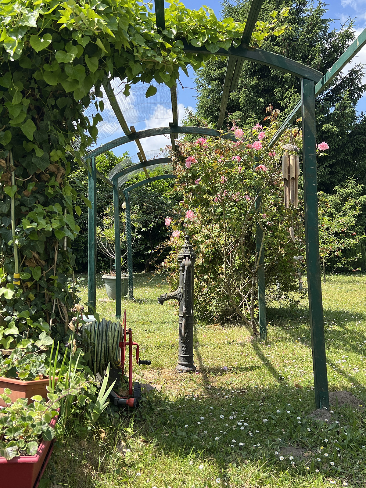 At the garden’s center rests a small pond, surrounded by bird feeders and stone baths. There, the rouges-gorges– tiny birds with bright red breasts- come to flutter, splash, and sing. They baptize themselves in light and water, nibble in the quiet, and bask in their own little heaven on earth.